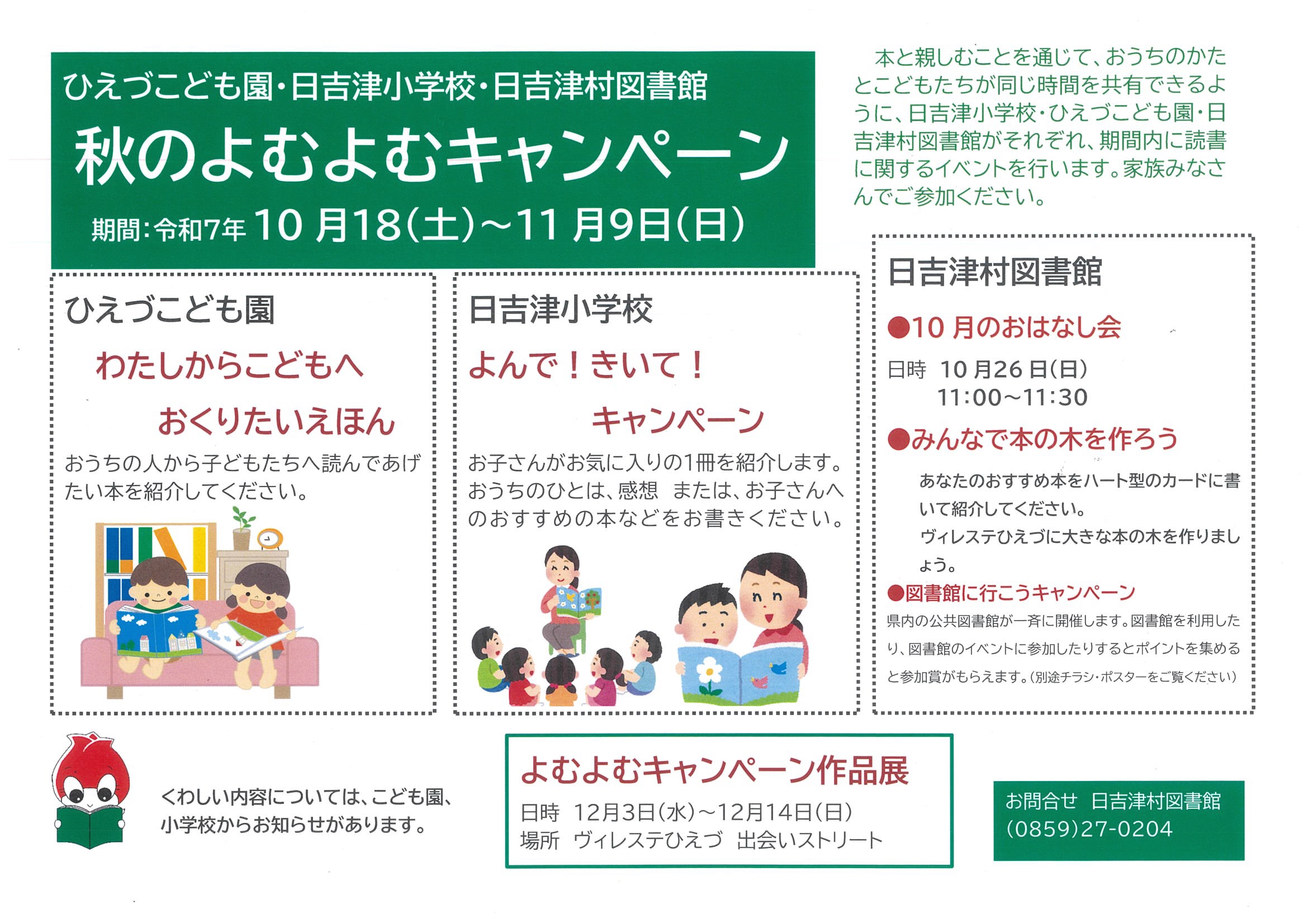 日吉津小学校・ひえづこども園・日吉津村図書館が共催で秋の読書週間に「よむよむキャンペーン」を開催します。それぞれの取り組みについて12月3日から作品展示をする予定です。