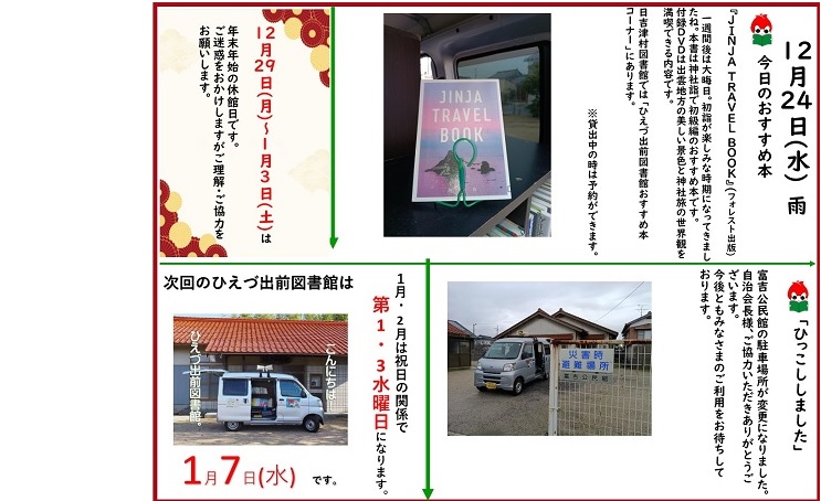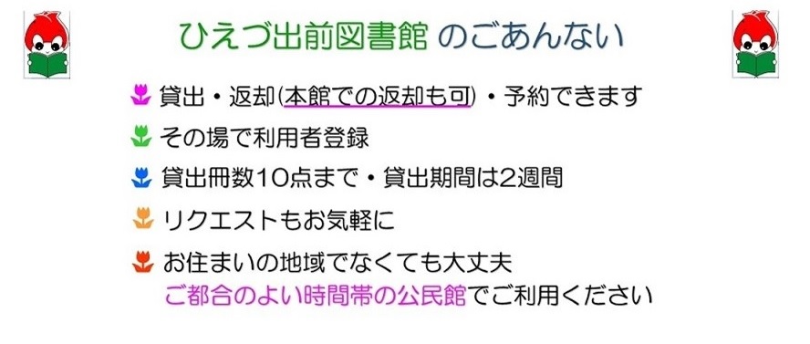 ※1・2月のひえづ出前図書館は祝日の関係で第1・3水曜日になります。※