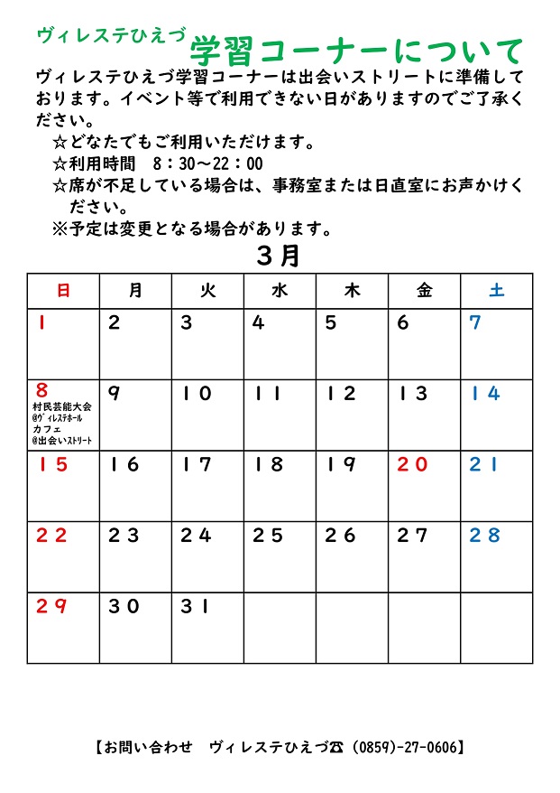 ヴィレステひえづ学習コーナーは出会いストリートに準備しております。