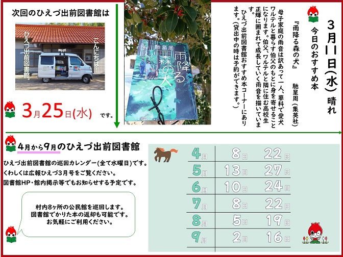 「ひえづ出前図書館日記 3月11日(水) 晴れ」